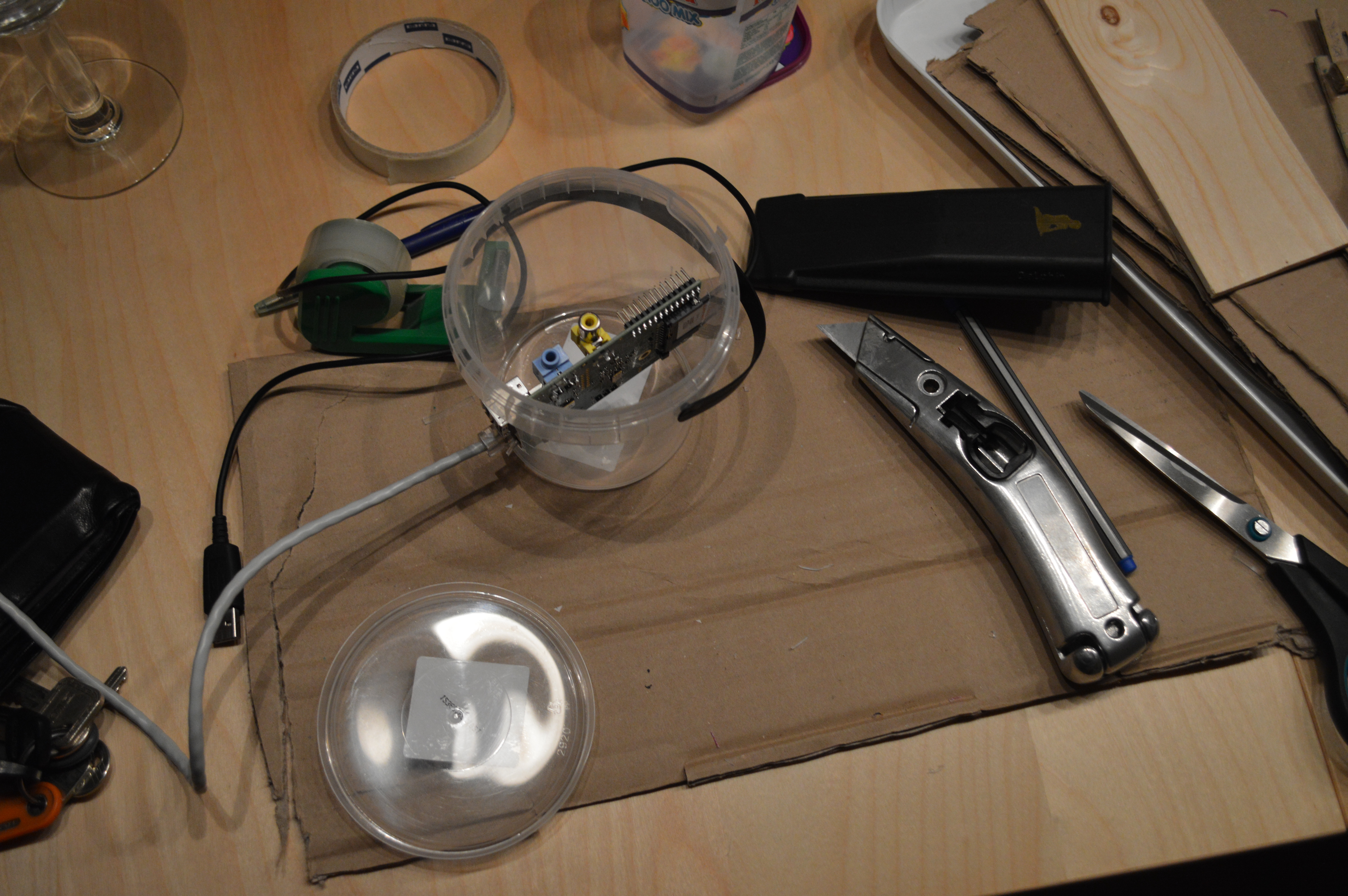 but to leave it on the floor without a case is something that I could not do. Luckily I had some time, a knife, and a plastic bucket I bought some olives in earlier. And it fit! Side-ways!